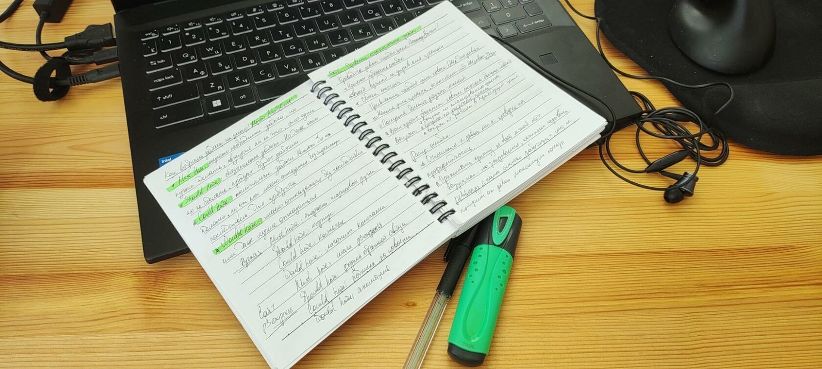 Также я записывала важные мысли от руки в тетрадь. Мне проще воспринимать информацию визуально, к тому же моторика помогает упорядочить знания в голове.